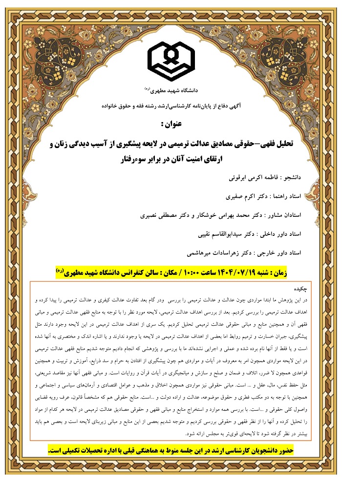 اطلاعیه جلسه دفاع از پایاننامه کارشناسی ارشد رشته فقه و حقوق خانواده؛ خانم فاطمه اکرمی ابرقوئی ۱۷ مهر ۱۴۰۴ | ۱۰:۴۶ آموزش و تحصیلات تکمیلی مقطع کارشناسی ارشد جلسات دفاع تعداد بازدید:۲۳