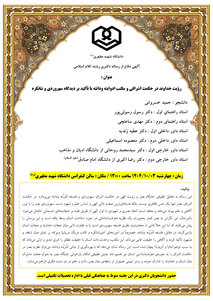 اطلاعیه جلسه دفاع از رساله دکتری رشته کلام اسلامی ؛ آقای حمید خسروانی ۳۰ آذر ۱۴۰۴ | ۱۴:۰۲ اطلاعیه آموزش و تحصیلات تکمیلی مقطع دکتری جلسات دفاع تعداد بازدید:۲۷