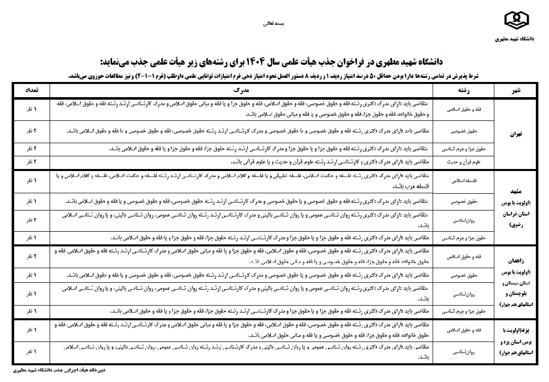 | یزد (اولویت با بومی استان یزد و استانهای همجوار) | فقه و حقوق اسلامی | متقاضی باید دارای مدرک دکتری رشته فقه و حقوق خصوصی، فقه و حقوق اسلامی، فقه و حقوق جزا و یا فقه و مبانی حقوق اسلامی و مدرک کارشناسی ارشد رشته فقه و حقوق اسلامی، فقه و حقوق خانواده، فقه و حقوق جزا، فقه و حقوق خصوصی و یا فقه و مبانی حقوق اسلامی باشد. | 1 نفر |