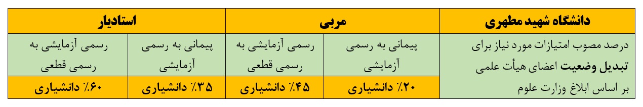 - تبدیل وضعیت استخدامی اعضای هیأت علمی از دو طریق ارتقاء یا کسب درصد معینی از جداول امتیازات ارتقاء امکانپذیر است.